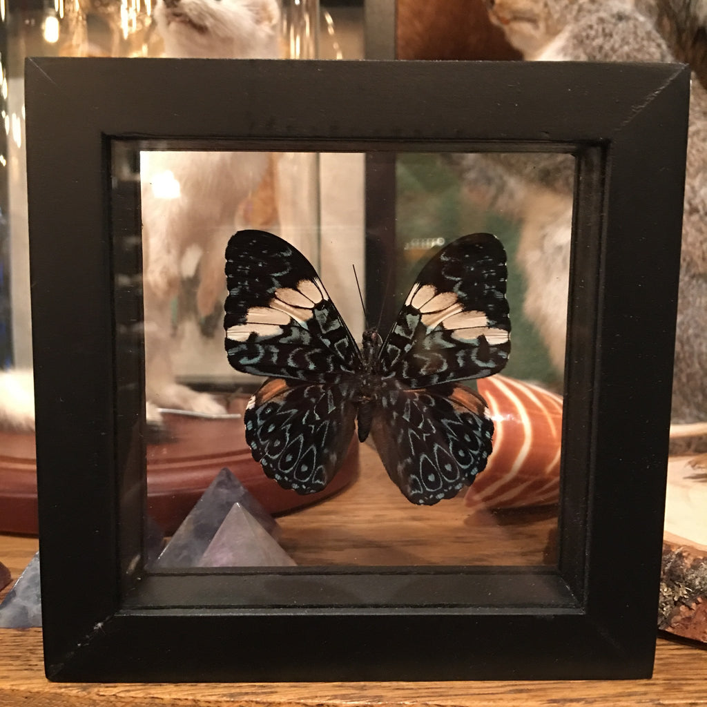 Various species of Hamadryas mounted single butterfly in a double glass black wood frame. Measures 4.75 x 4.75"