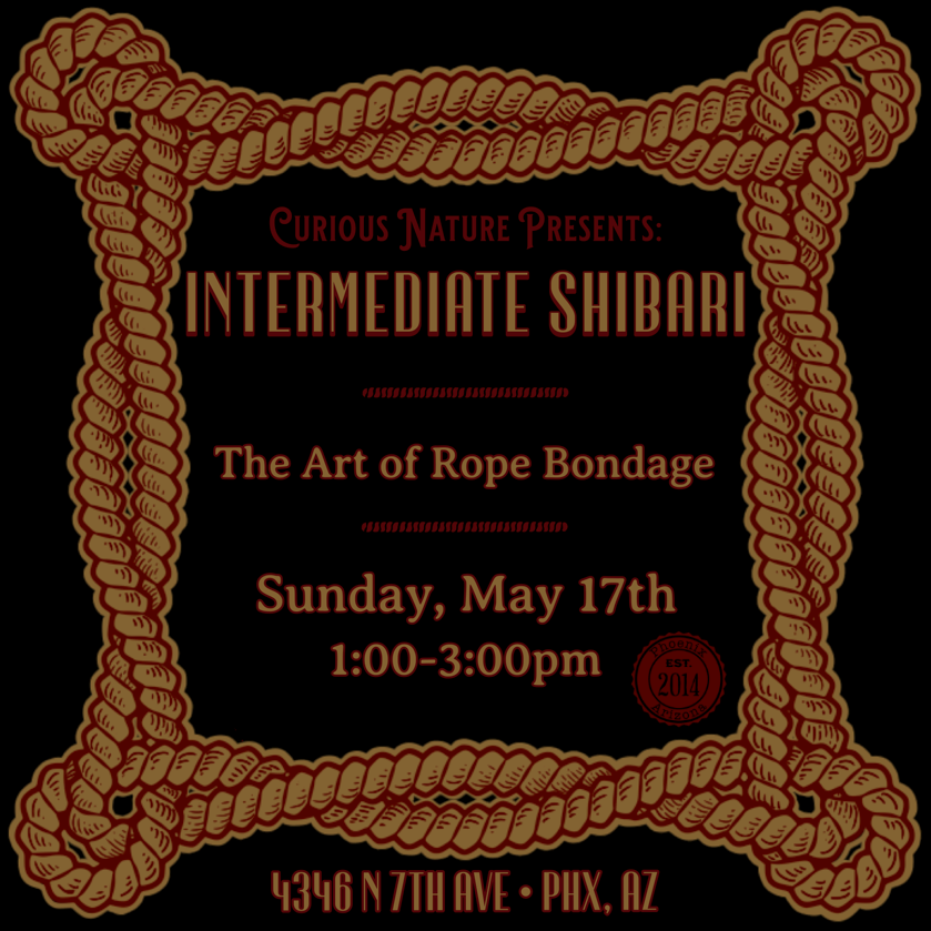 Join us on Sunday, May 17th from 1-3pm to dive deeper into to rope bondage, known as Shibari! In this intermediate Shibari class, our focus will be on specific knots, more in depth safety protocol and 2-3 step by step body harnesses! We will learn how to tie half hitches, munter hitches and X frictions. We will also learn an Agura harness, a Futo harness and/or a Hip harness. This class will explore more intricacies into body contortion and discussion around shibari suspension.