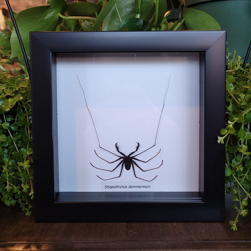 Stygophrynus dammermani Indonesian cave spider mounted in a black 6x6" shadow box frame.