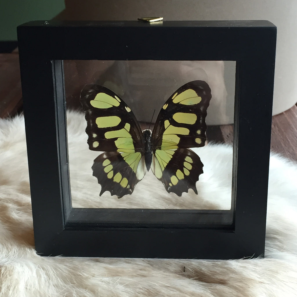 Siproeta stelene, or Malachite, mounted single butterfly in a double glass frame. 4" x 4"