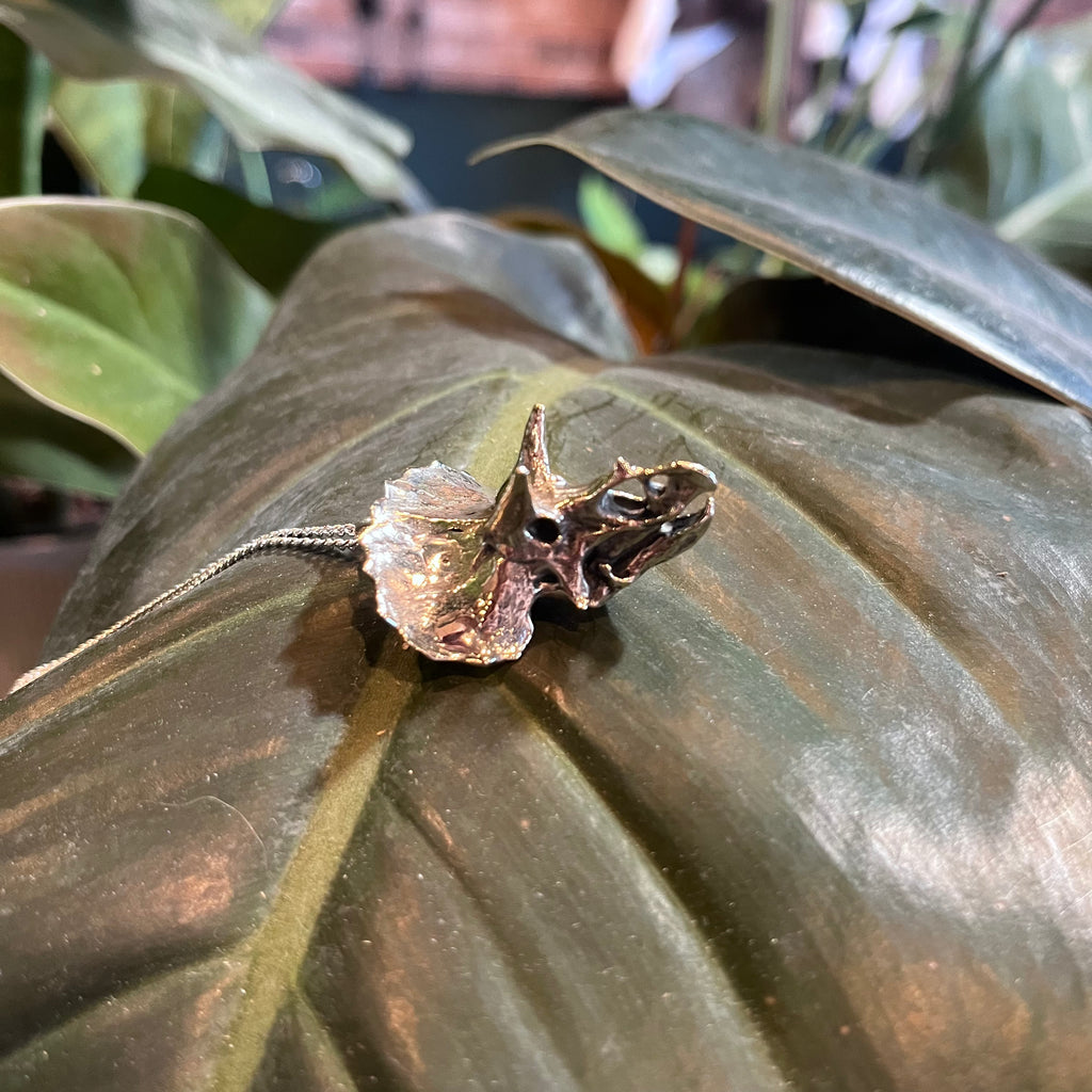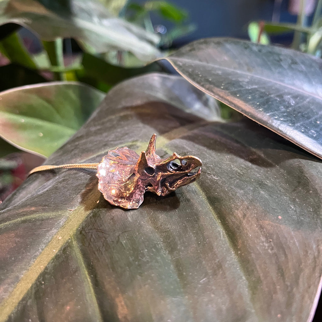 Triceratops horridus - With its unique frill and iconic horns, the Triceratops is one of the most easily recognizable dinosaurs. It also has a bird-like beak which it used to crush and eat shrubs and other plant life. Includes matching 24 inch chain. Wooden display base optional. Skull dimensions: 27mm x 35mm x 34mm