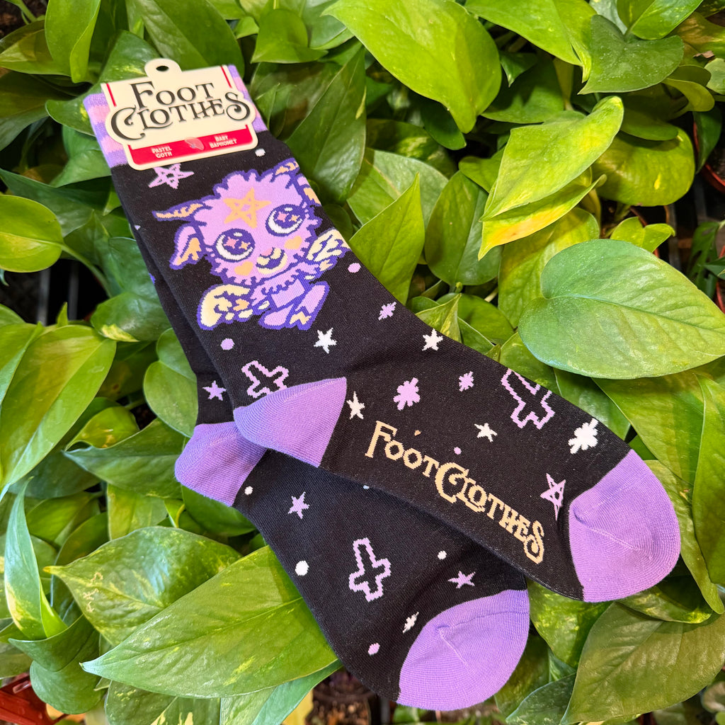 Cozy socks featuring baby Baphomet in a pastel color scheme.