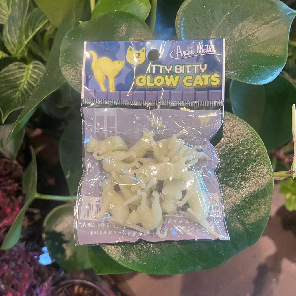 These soft vinyl Itty Bitty Glow Cats are between 3/8" (0.9 cm) and 1" (2.5 cm) tall. You get two each of six different styles. These will occupy your attention day and night, just like real cats! Illustrated bag of 12 Itty Bitty Glow Cats.
