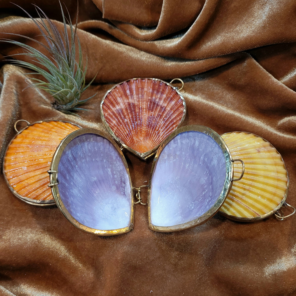 Cute little coin purse made from two pectin seashells. Measures about 3” in length.